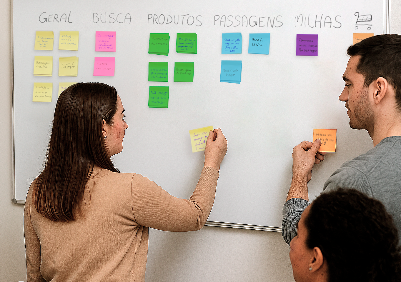 Using the Card Sorting method, we grouped the comments into the following categories: general, search, product, airline tickets, miles and exchange. Then we assigned a score from 1 to 5 for the severity of the issues on each post-it. This helped us visually organize the pain points extracted from the Likert comments and understand their related categories, allowing us to identify the severity of each category’s impact on the customer experience.